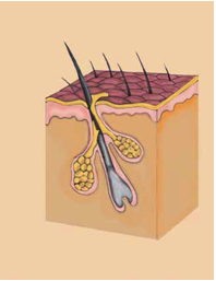 Keratinocytes are the pink cells lining the gland and hair follicle. (They also make up most of the epidermis.)